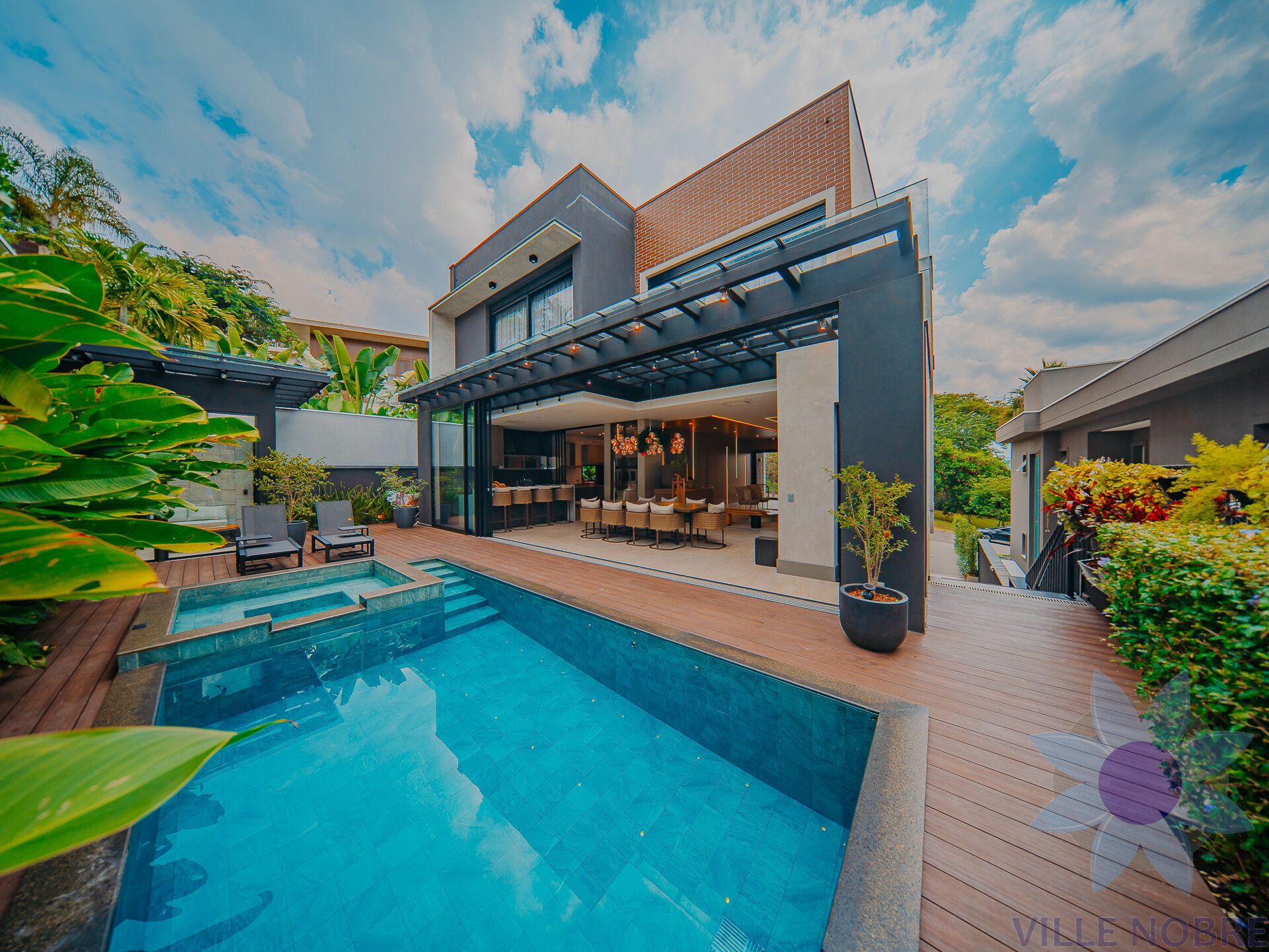 Além disso, a casa possui uma garagem para até 8 carros, adega, sistema de cisterna com capacidade para 2400 litros, sala de estar integrada, sala de jantar, churrasqueira com coifa profissional, cozinha equipada com eletrodomésticos importados, lavanderia, piscina com iluminação e spa, duplo sistema de aquecimento (solar e a gás), escritório, lavabo, sistema de purificação de água central, água potável em todas as torneiras da casa, triplo sistema de aquecimento de água (solar, gás e elétrico), preparação para energia solar, pé direito diferenciado de 3,02m, sistema de ar condicionado, lindo paisagismo e automação Alexa.