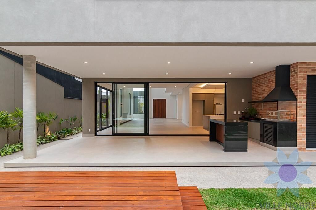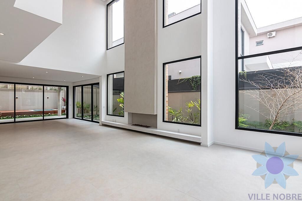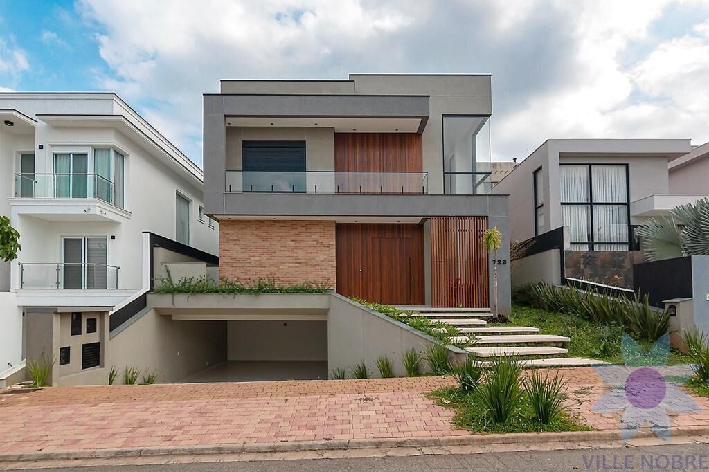 m um terreno de 420 m² e impressionantes 480 m² de construção, esta residência se destaca pelo projeto sofisticado e funcional, com pé-direito de 7 metros que valoriza a iluminação natural e a sensação de amplitude. Os ambientes sociais são integrados, com sala de estar luminosa, cozinha em conceito aberto conectada à sala de jantar e uma ampla área gourmet ideal para receber. O lazer é completo, com piscina/jacuzzi de alvenaria e deck em madeira cumaru. São 4 suítes principais, além de uma suíte de serviço, totalizando 7 banheiros, escritório privativo, área de serviços com despensa e armários planejados na cozinha, churrasqueira e despensa. Conta ainda com persianas blackout automatizadas, porcelanato em toda a casa, garagem para até 5 veículos com entrada independente e soluções sustentáveis, como sistema de reuso de água e aquecimento solar.